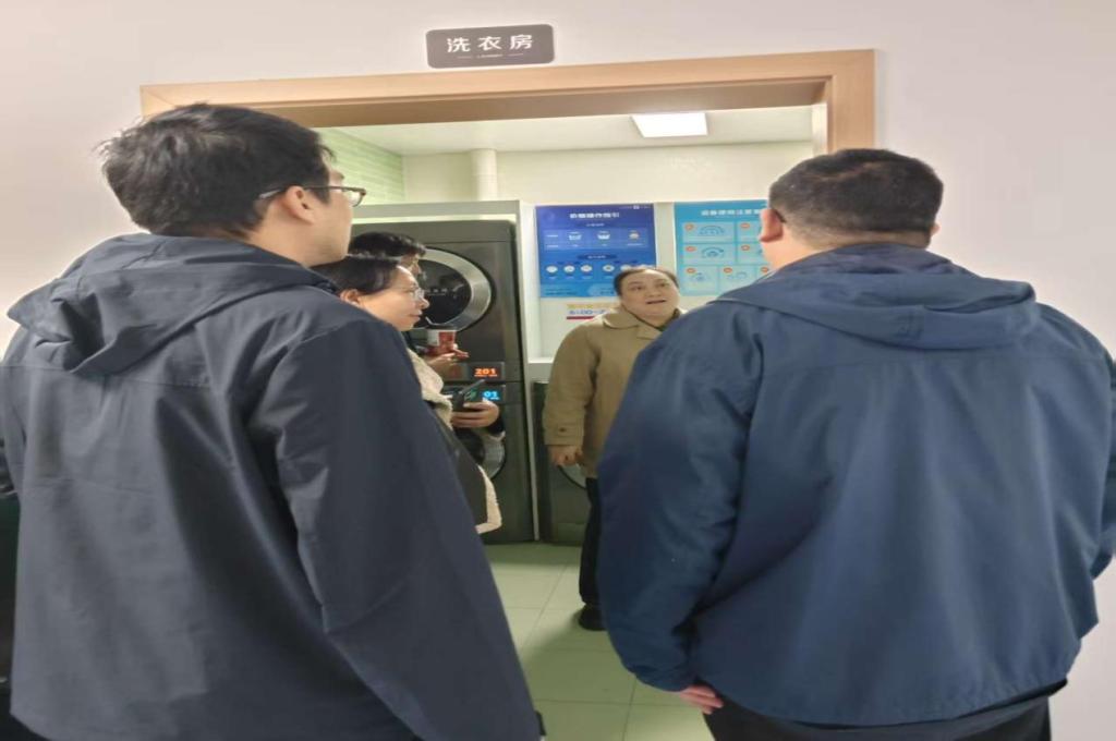 会后,考察组一行前往公寓15号楼实地察看太阳能设备安装布局与运行使用情况,就逆变器等关键设备的技术参数、维护要点等问题与建设方进一步咨询沟通。同时,考察组参观了宿舍楼公共区域及学生宿舍,细致考察饮水机、洗衣房、学生洗浴等便民设施的配置管理情况,深入学习宿舍内部功能布局与空间规划经验。