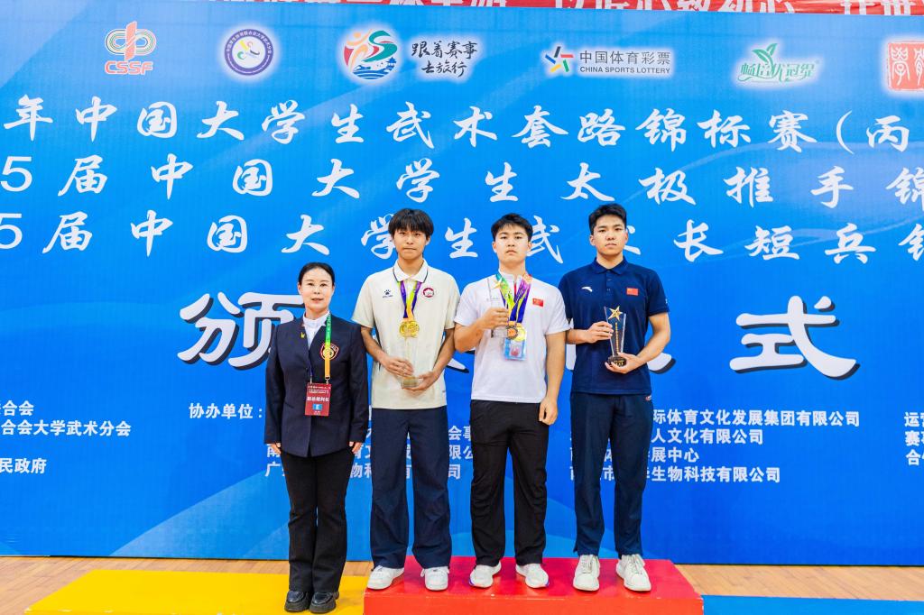 10月25日至31日,由教育部中国大学生体育联合会主办的2025年中国大学生武术套路(丙组、丁组)锦标赛、第5届中国大学生太极推手锦标赛、第5届中国大学生武术长短兵锦标赛在南通体育会展中心举行。本次赛事共吸引了全国278所高校的3000余名武术健儿,是今年全国级别最高、规模最大、影响力最广的高校武坛盛会。我院代表队发挥出色,以精湛技艺与优良赛风斩获一金三银一铜,并夺得太极推手团体季军。