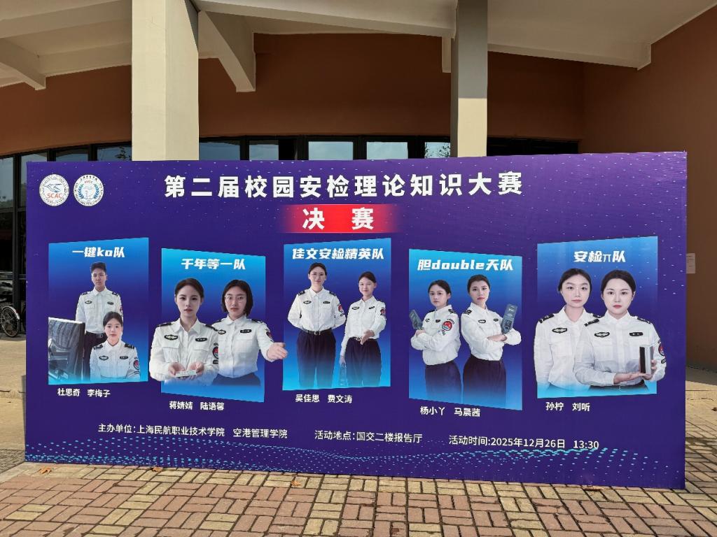 为加强民航安检领域人才培养,以赛促学夯实理论基础,2025年12月26日下午,第二届校园安检理论知识大赛决赛在浦东校区国交二楼报告厅顺利举办。本次大赛吸引了众多师生关注,空港管理学院党总支副书记柏婷、空中交通管理教研室主任张晓燕、专任教师及辅导员代表、24级与25级民航安全技术管理专业学生代表全程观看比赛,民航安全技术管理专业教学团队教师担任决赛裁判及工作人员。