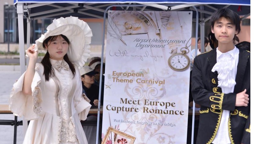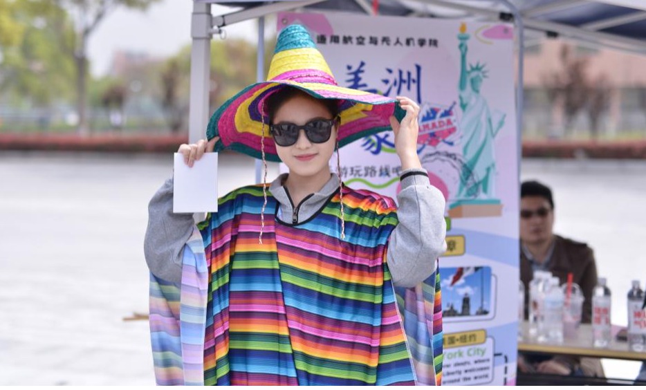 民航乘务学院负责的南美洲板块以“云端之上的热情大陆”为主题,揭开南美热情奔放的文化面纱。现场设置了“超级模仿秀”,“桑巴节奏——拍手接龙”,“印加宝藏——盲盒问答”等趣味游戏,让同学们在探戈的旋律中感受激情,在云端的视角下读懂南美。民航运输学院负责的亚洲板块通过“拼图抽抽乐”游戏,让参与者抽取国家英语名称卡片,寻找对应的特色拼图,在指尖拼出“一带一路”的亚洲风情。此外,日语认读和短句挑战等游戏也吸引了大批同学闯关进阶,在欢笑中推开日语世界的大门。通用航空与无人机学院打造的“北美洲印象”主题活动,设置了墨西哥、纽约、加拿大等城市集章环节,穿插“节奏大师 Rhythm Master”和“你画我猜 You Act, I Guess”等互动游戏,现场气氛热烈。此外,空港管理学院、飞机制造与维修学院也为同学们精心准备了多个别具匠心的小游戏,吸引众多师生驻足打卡,流连忘返。